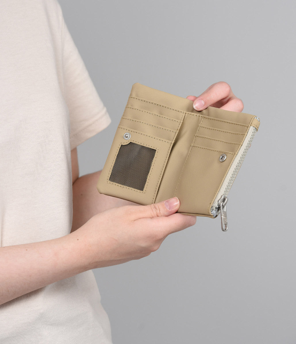 The KCB Stamp small card holder features multiple slots for your cards, a bill compartment, and a zippered compartment for coins. Its convenient size allows you to carry it in smaller bags wherever you go.